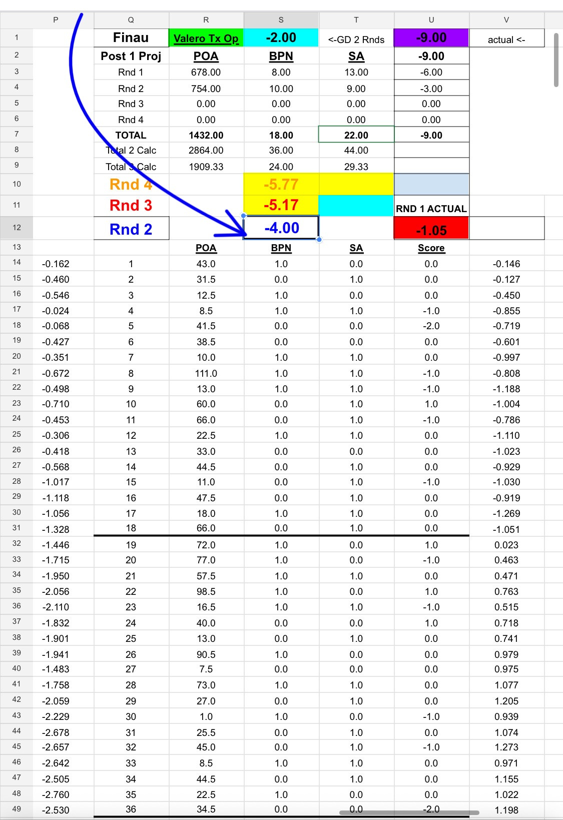Below you’ll see Finau’s first two rounds projected to four rounds (the one in the black bordered space in the center above BPN):